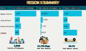 The graph above shows the summary of the region-wide clean up activities as to the total number of participants, total trash collected, and total distance covered. As seen in the graph, the province of Misamis Oriental topped among the four provinces with 2,407 participants or equivalent to 61% with 26,399.1 kilograms or 83% of the total trash collected within the 13.98km cleaned-up coastal areas of the province.