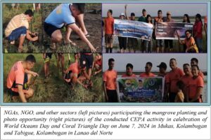 A total of 68 participated the Mangrove planting in Mukas Kolambugan and Tabigue Kolambugan in Lanao del Norte and the initiative resulted in the successful planting of 500 propagules of the Bakaun species in the site as another medium of the celebration of the World Oceans Day and Coral Triangle Day on June 7, 2024.