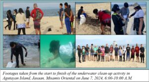 The regional office of DENR X conducted the simultaneous coastal and underwater clean-up activity at Agutayan Island, Jasaan, Misamis Oriental with a total of 21 participants lead by the CDD-CRFMS participated by the LGU of Jasaan, Bamtay Dagat, and Mines and Geoscience Bureau X. Throughout the clean-up, it was found that the most common trash collected is microplastics which may be due to the garbage left by tourist in the island as well as washed in debris from the city proper through the ocean.