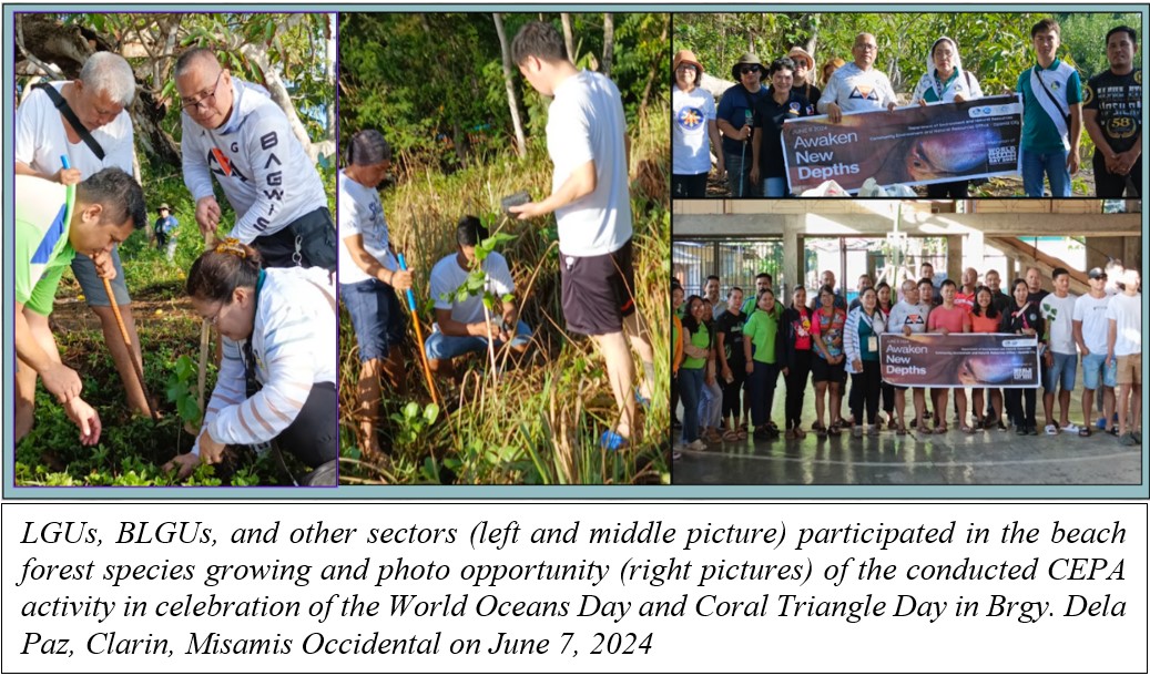This CEPA activity was an initiative lead by the CENRO Ozamiz together with NGAs, BLGUs, LGUs and other sectors (LGU Clarin, BLGU Dela Paz, PNP-Clarin, Philippine Ports Authority-Ozamiz, Global Port Terminal Ozamiz Inc. , KABALIKAT CIVICOM ASSOCIATION INC and Alpha Eta Upsilon) as a part of the World Oceans Day and Coral Triangle Day Celebration. As beach forests are a vital ecosystem that provide numerous benefits one of it being as natural barriers against coastal erosion, protect shorelines from storm surges, and support diverse wildlife habitats. Conducting said activity is crucial in restoring and preserving these critical areas. This proactive approach not only combats the adverse effects of climate change but also fosters a healthier and more resilient coastal environment.