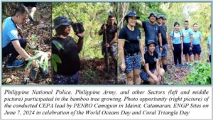 There are plenty of other CEPA activity that could be conducted and PENRO Camiguin decided that they need to replenish and sustain the bamboo tree population in Mainit, Catamaran, Camiguin ENGP, together with Philippine National Police (PNP), Bureau of Jail Management and Penology (BJMP), Barangay Council of Mainit in Catarman, and, NAGPAKABANA MPC. This to show that any initiative in line with the conservation and protection of environment, and not just in coastal is always welcome and encouraged.